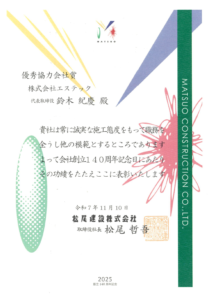 松尾建設株式会社様より優秀協力会社賞を受賞しました